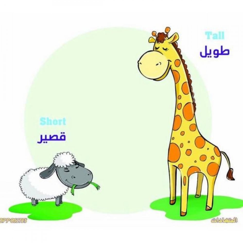 كتاب تعليمي يوضح المتضادات باللغة العربية والإنجليزية مع صور جذابة